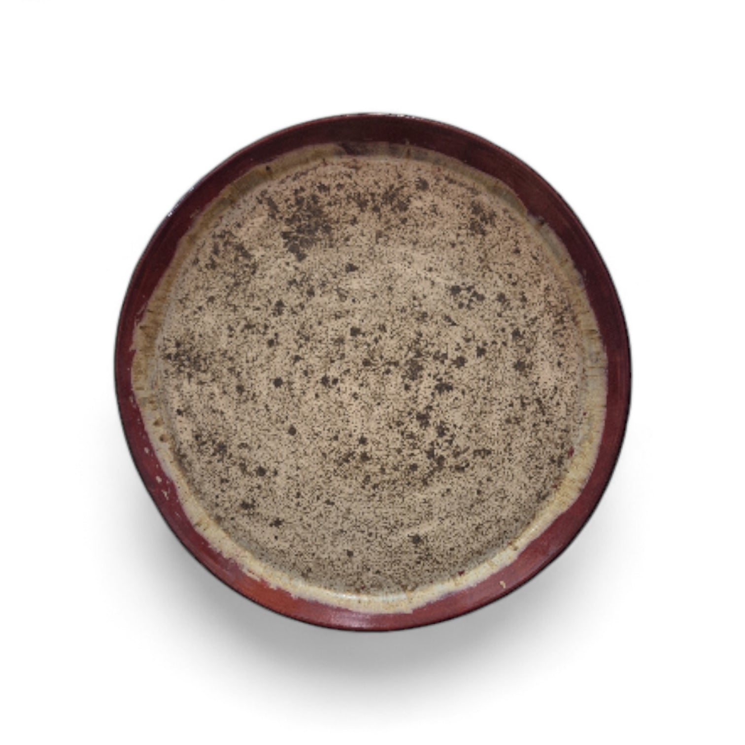 Handcrafted serving platter featuring a warm cream glaze with distinctive brown speckles and a rich dark red rim. This artisanal piece showcases the natural beauty of pottery craftsmanship—the subtle texture and earthy tones create an inviting presentation for any table. Perfect for entertaining, this platter brings authentic, handmade character to your serveware collection. The photographs capture its essence, but you'll truly appreciate its depth and craftsmanship in person.